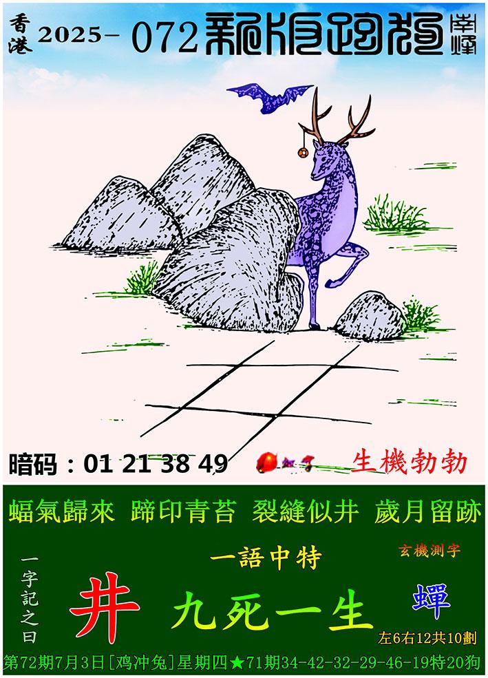 072期新版跑狗一字記之曰:【井】 玄機測字:【蟬】 一語中特:九死一生