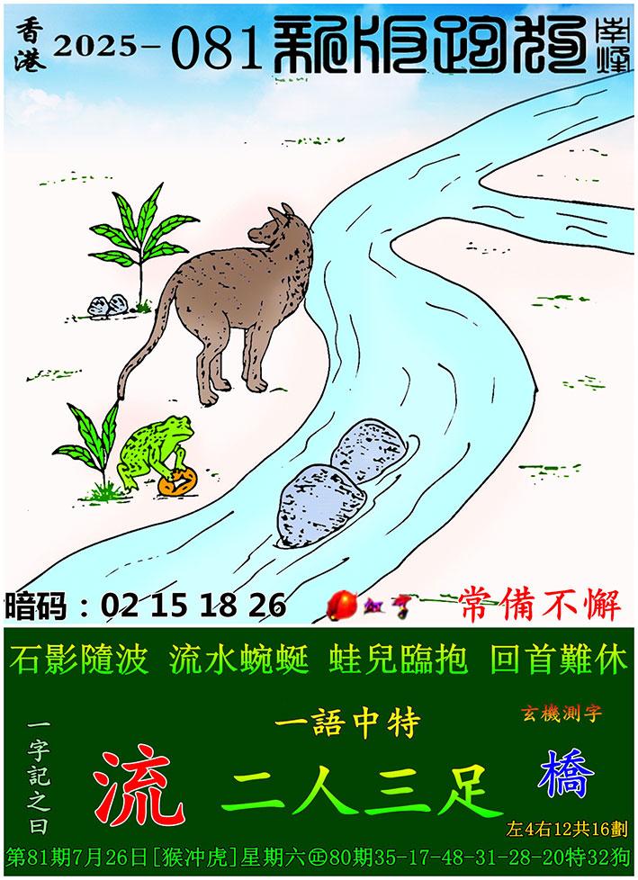 081期新版跑狗一字記之曰:【流】 玄機測字:《橋》 一語中特:二人三足