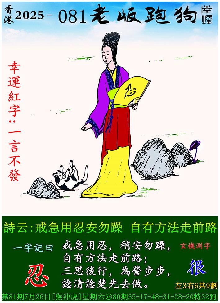 081期老版跑狗一字記之曰:【忍】 詩雲:戒急用忍安勿躁 自有方法走前路。