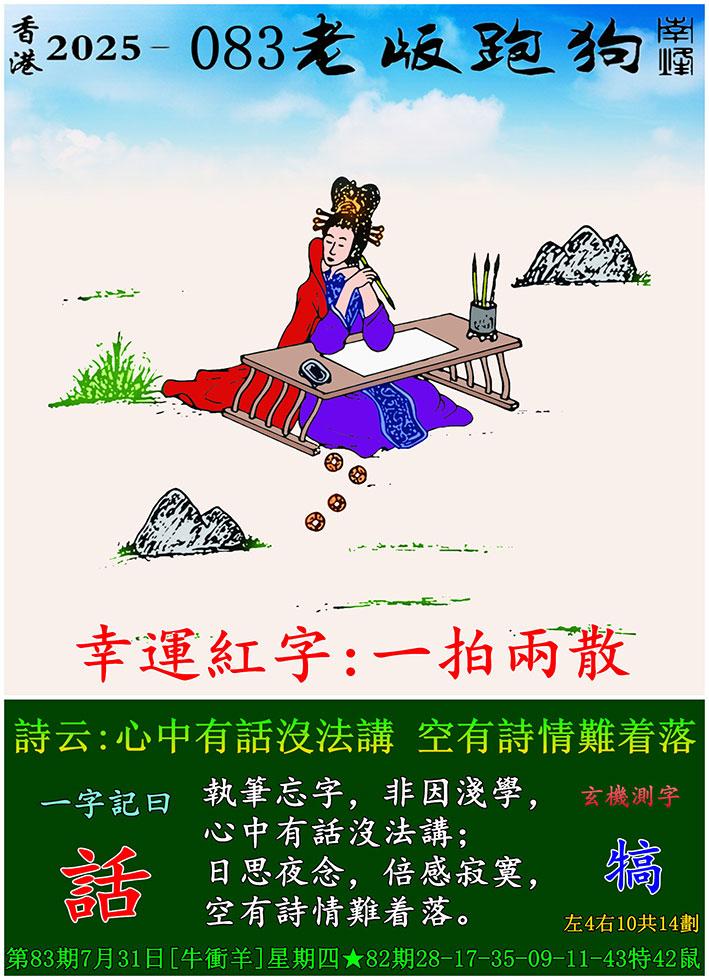 083期老版跑狗一字記之曰:【話】 詩云:心中有話沒法講,空有詩情難着落。