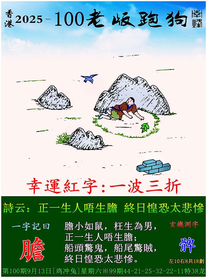 100期老版跑狗一字記之曰:【膽】 詩雲:正一生人唔生膽,終日惶恐太悲慘。