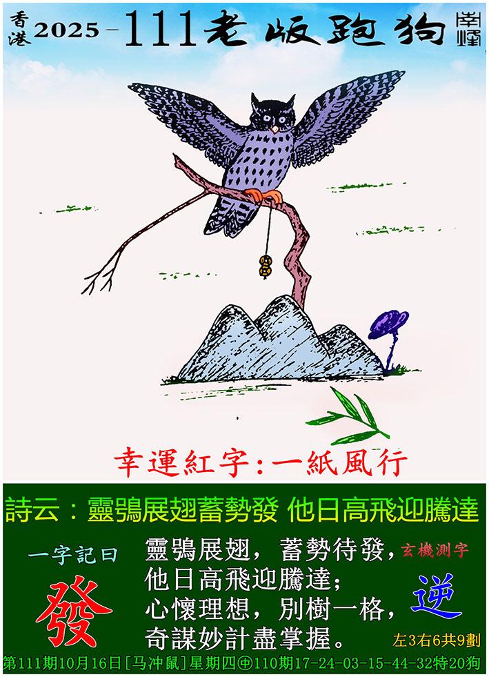 111期老版跑狗一字記之曰:【發】 詩雲:靈鴞展翅蓄勢發,他日高飛迎騰達。