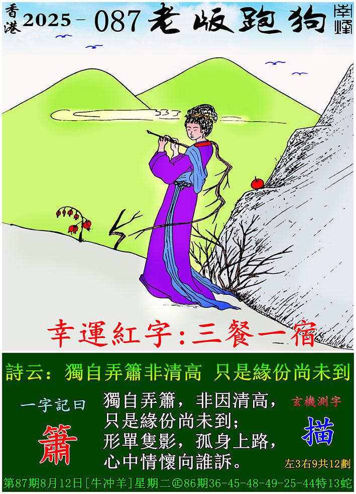 087期老版跑狗一字記之曰:【簫】 詩雲:獨自弄簫非清高,只是緣份尚未到。
