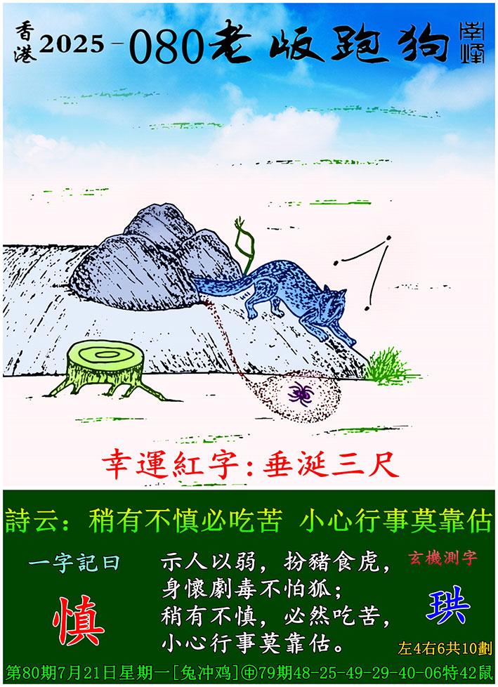 080期老版跑狗一字記之曰:【慎】 詩雲:稍有不慎必吃苦,小心行事莫靠估。