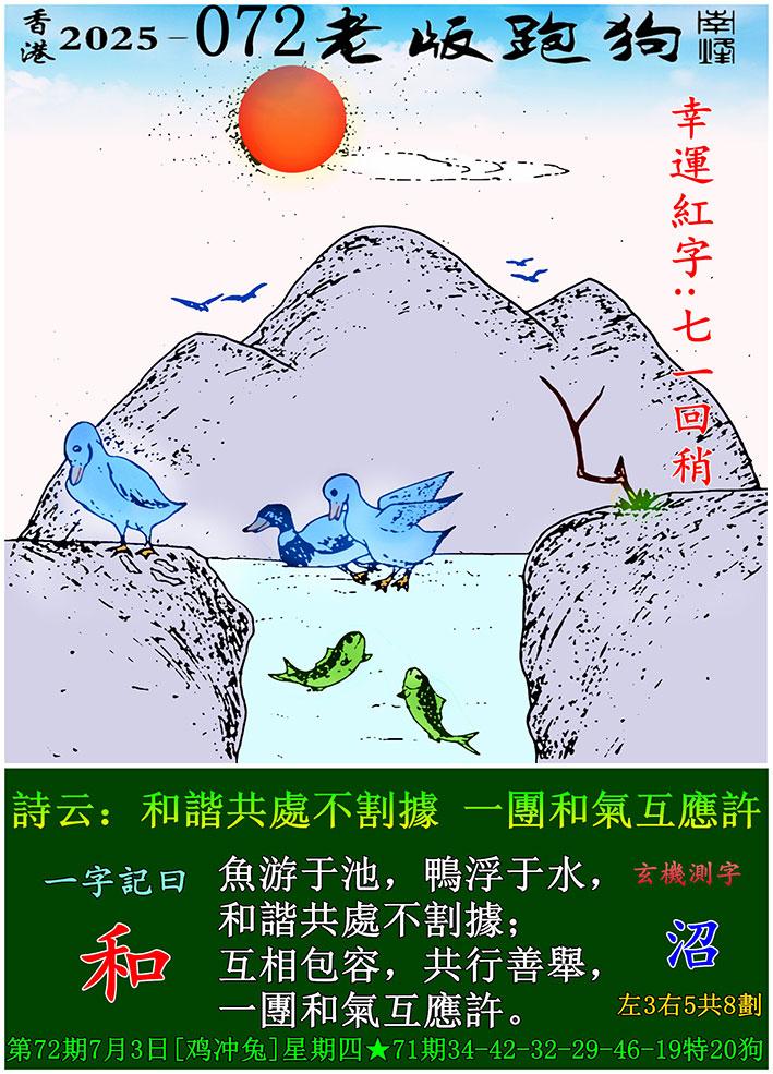 072期老版跑狗一字記之曰:【和】 詩雲:和諧共處不割據,一團和氣互應許。