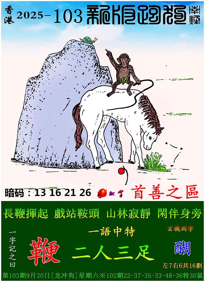 103期新版跑狗一字記之曰:【鞭】 玄機測字:《醐》 一語中特:二人三足